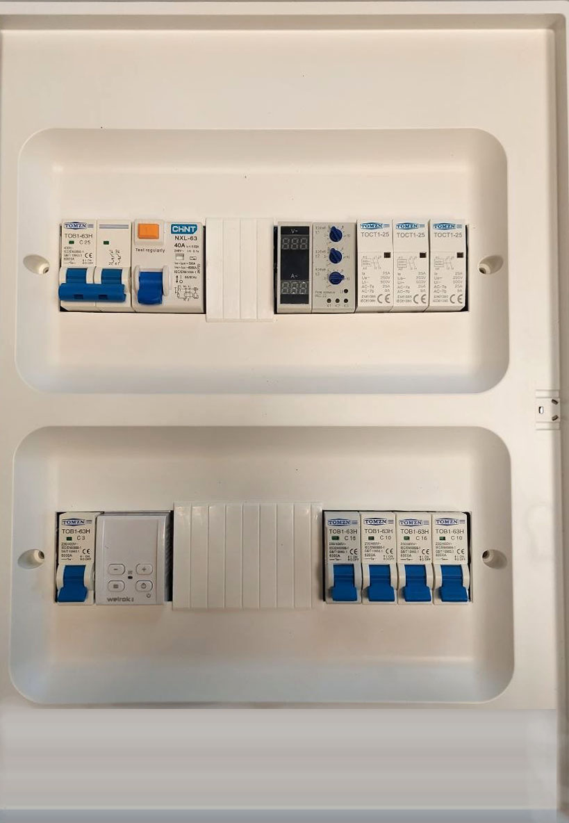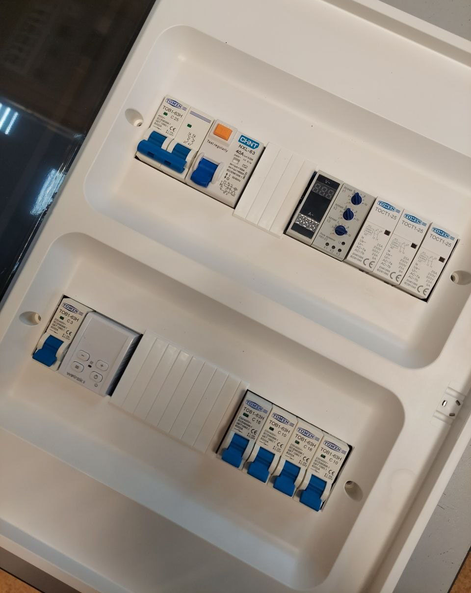 Шкаф управления ШОБ-4-220-ТС4(7)-Li Кол-во фаз: 1, 220 Вольт Ток вводного защитного выключения: 25 А Тип регулятора температуры: Регулятор температуры ТС-4 HS Electro(опционально допускается замена на ТС 7 с датчиком садков), Li Welroc. Мощность нагревательных секций : 5 кВт. Назначение: обогрев кровли и водосточной системы. Сооружения: таунхаусы, частный сектор с однофазным вводом для системы электрообогрева.
