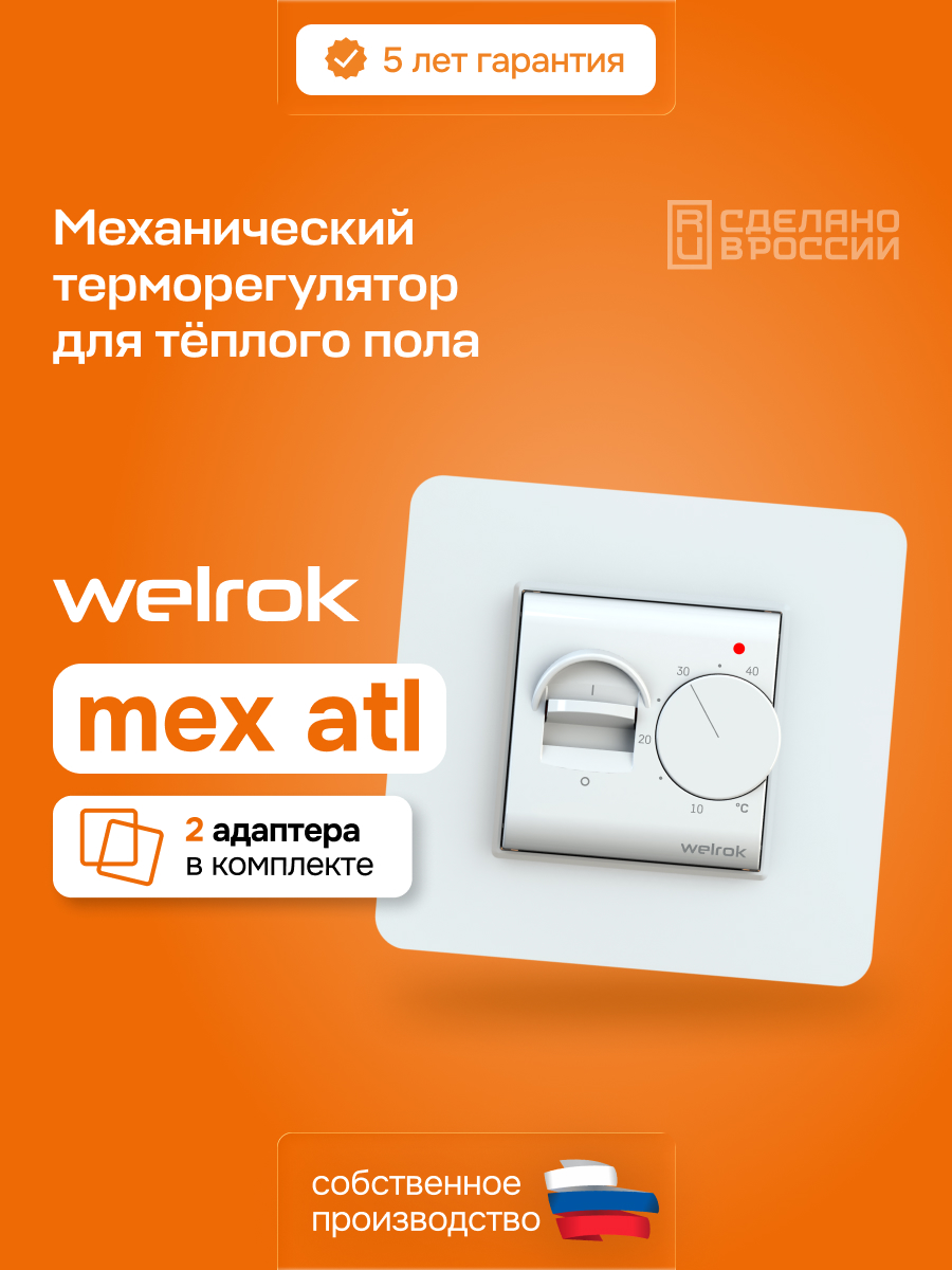Терморегулятор для управления системами электрообогрева пола и электрического отопления помещений. Welrok mex atl — простой терморегулятор для теплого пола с индикацией температуры пола и с возможностью монтажа в рамки Systeme Electric. Благодаря тумблеру вы можете отключить термостат, не меняя температуру. В комплекте адаптеры для рамок Atlas Design, Atlas Design Air от Systeme Electric, BRITE от IEK, Стокгольм, Эпика от EKF. Терморегулятор Welrok mex предназначен для поддержания постоянной температуры