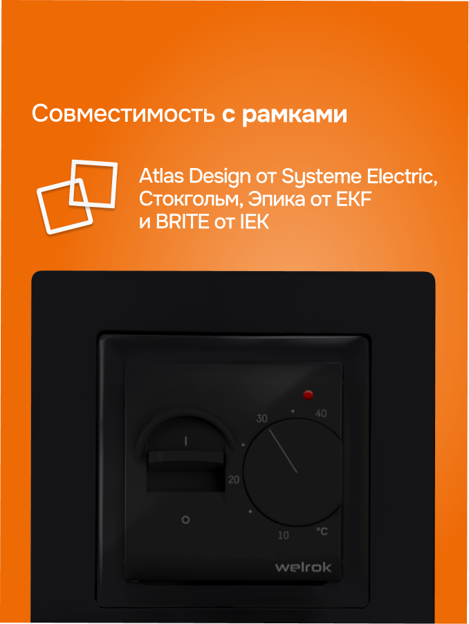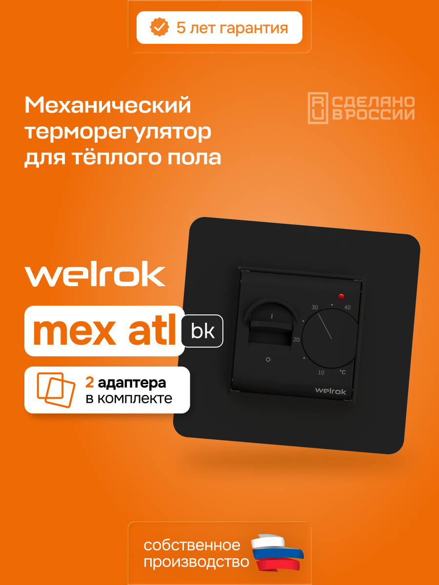 Терморегулятор для управления системами электрообогрева пола и электрического отопления помещений. Welrok mex bk atl — простой терморегулятор для теплого пола с индикацией температуры пола и с возможностью монтажа в рамки Systeme Electric. Благодаря тумблеру вы можете отключить термостат, не меняя температуру. В комплекте адаптеры для рамок Atlas Design, Atlas Design Air от Systeme Electric, BRITE от IEK, Стокгольм, Эпика от EKF. Терморегулятор Welrok mex предназначен для поддержания постоянной температуры