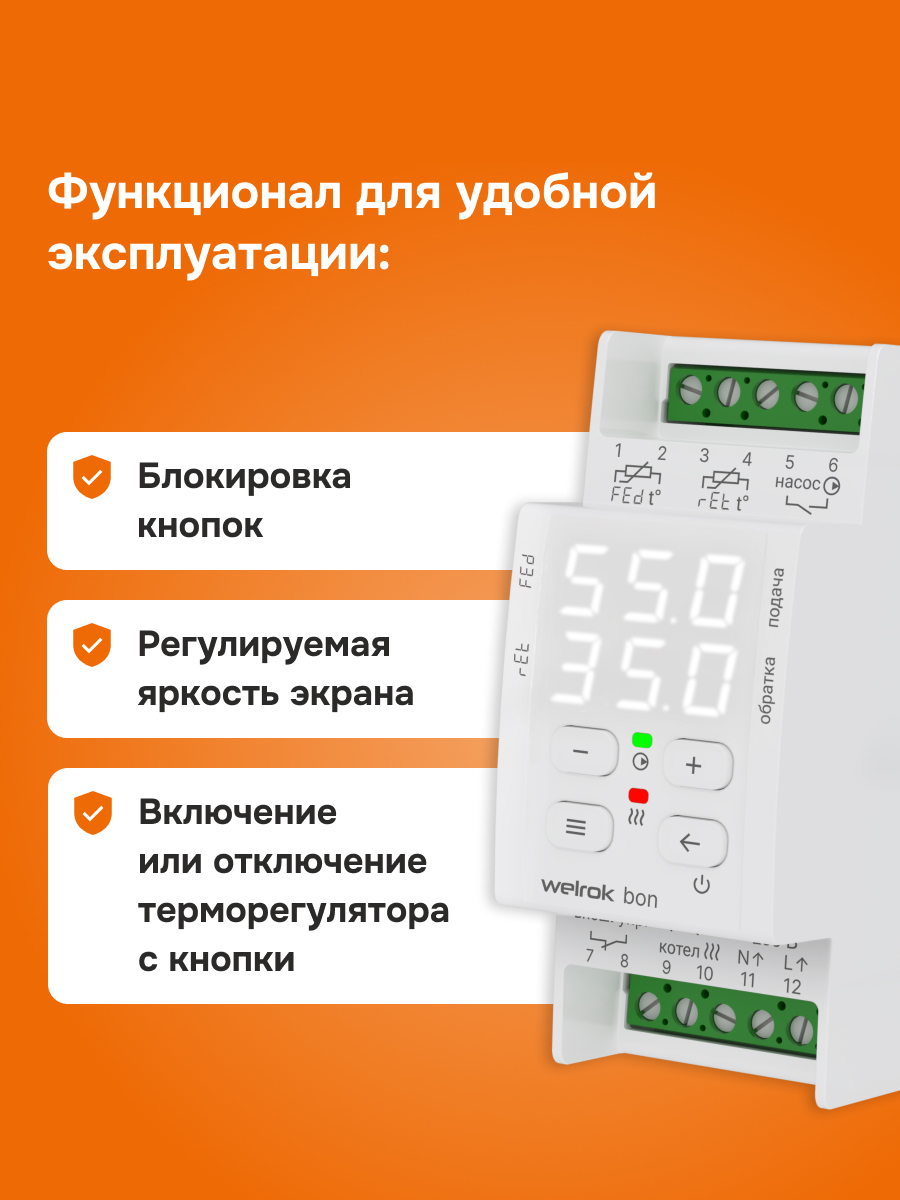 Welrok bon для управления электрическими системами отопления на основе электродных или ТЭНовых котлов обеспечивает комфорт и безопасность эксплуатации котла благодаря контролю температур подачи и обратки, а также возможности управления насосом и отслеживания его состояния. Welrok bon автоматизирует работу котла, увеличивает энергоэффективность системы, защищает котел от перегрева и пользователя от ожога. Характеристики Пределы регулирования температуры подачи 15…95 °C, шаг 1 °C